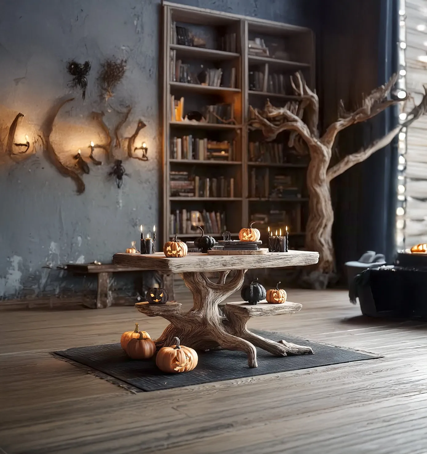 This rustic coffee table is inspired by natural driftwood forms. A thick rectangular top sits on a branching wood base, and two smaller platforms extend from the sides to create extra landing spots for decor, snacks, or candles. The result is a centerpiece that feels organic and story rich, perfect for cabin style and farmhouse living rooms. The photos highlight weathered texture and flowing lines through the base, with roots and branches that spread outward for visual drama. The main surface reads like a solid slab, while the side shelves add a tiered look without needing separate furniture. Because the table has multiple levels, it helps keep a coffee table scene organized while still feeling casual. Use the top for books and trays, and reserve the side platforms for small accents or seasonal styling. It also works well in a reading room where you want different heights for a lamp, a speaker, or a plant. Leave a little clearance around the branching base so the shape can be appreciated. To care for the wood, dust regularly and wipe with a soft cloth. Avoid soaking the surface and clean spills promptly. As with any natural wood piece, grain, texture, and small natural marks will vary, making each table one of a kind.