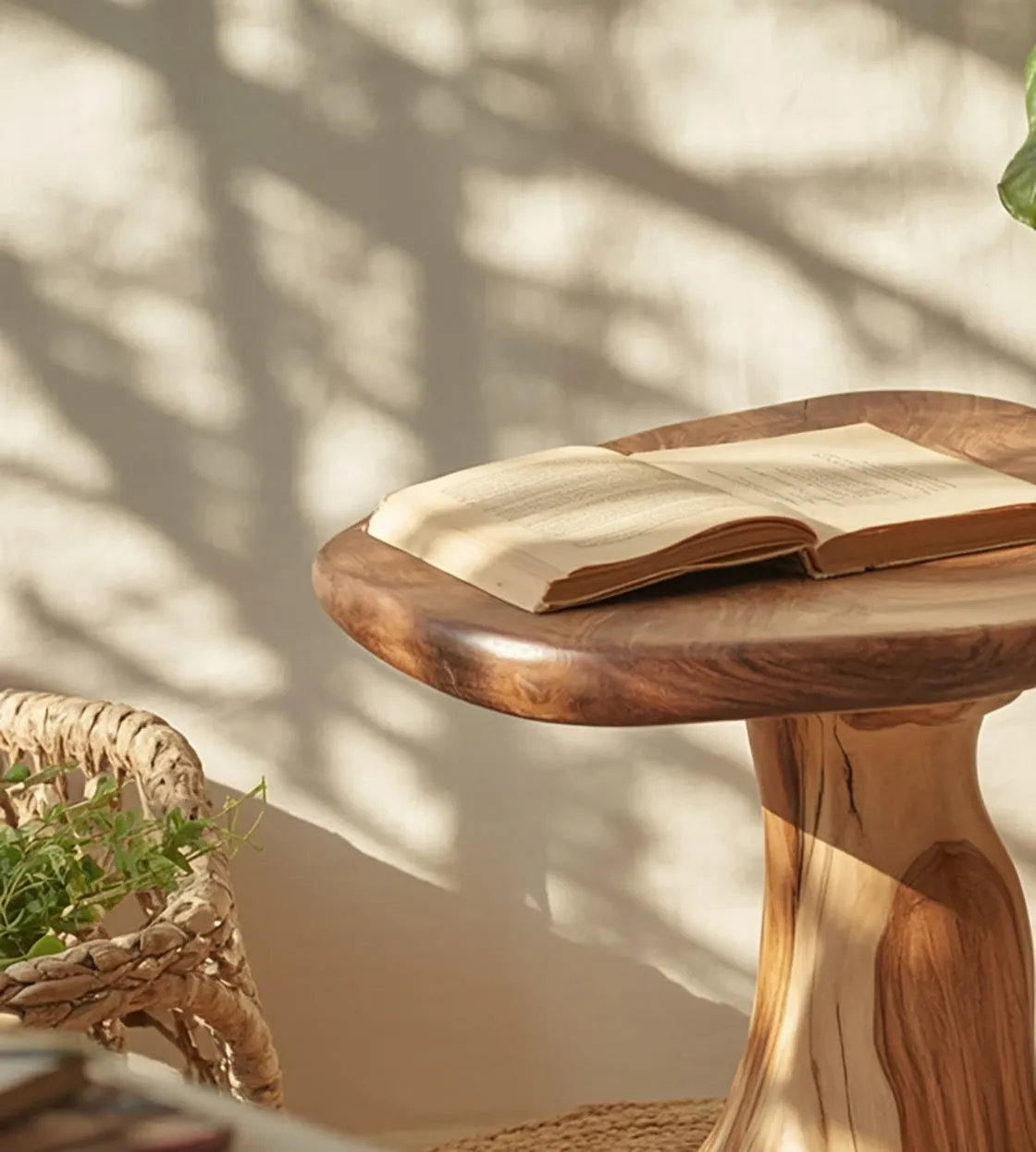 This mushroom shaped end table adds a soft, playful silhouette to modern farmhouse rooms. Crafted from solid wood, it features a wide round top and a gently flared pedestal base, creating a stable profile that feels both sculptural and functional. The wood grain on the base shows striking light and dark bands, and the top has a thick edge with a smooth rounded lip. The overall form is simple, which makes the natural patterning and warm tone stand out. Because the pedestal is centered, the table tucks neatly beside seating without awkward legs. Use it as a living room side table for books and a mug, or as a bedside table where you want a compact footprint. The rounded shape is also a nice match for curved sofas, boucle chairs, and woven rugs. Style it with a small tray to collect keys, or keep it minimal with a single vase. To keep the finish looking its best in everyday use, dust regularly and wipe spills promptly. Use coasters and avoid placing very hot items directly on the wood. Natural knots, grain shifts, and color variation mean no two tables look identical, which is part of the appeal of real wood furniture.