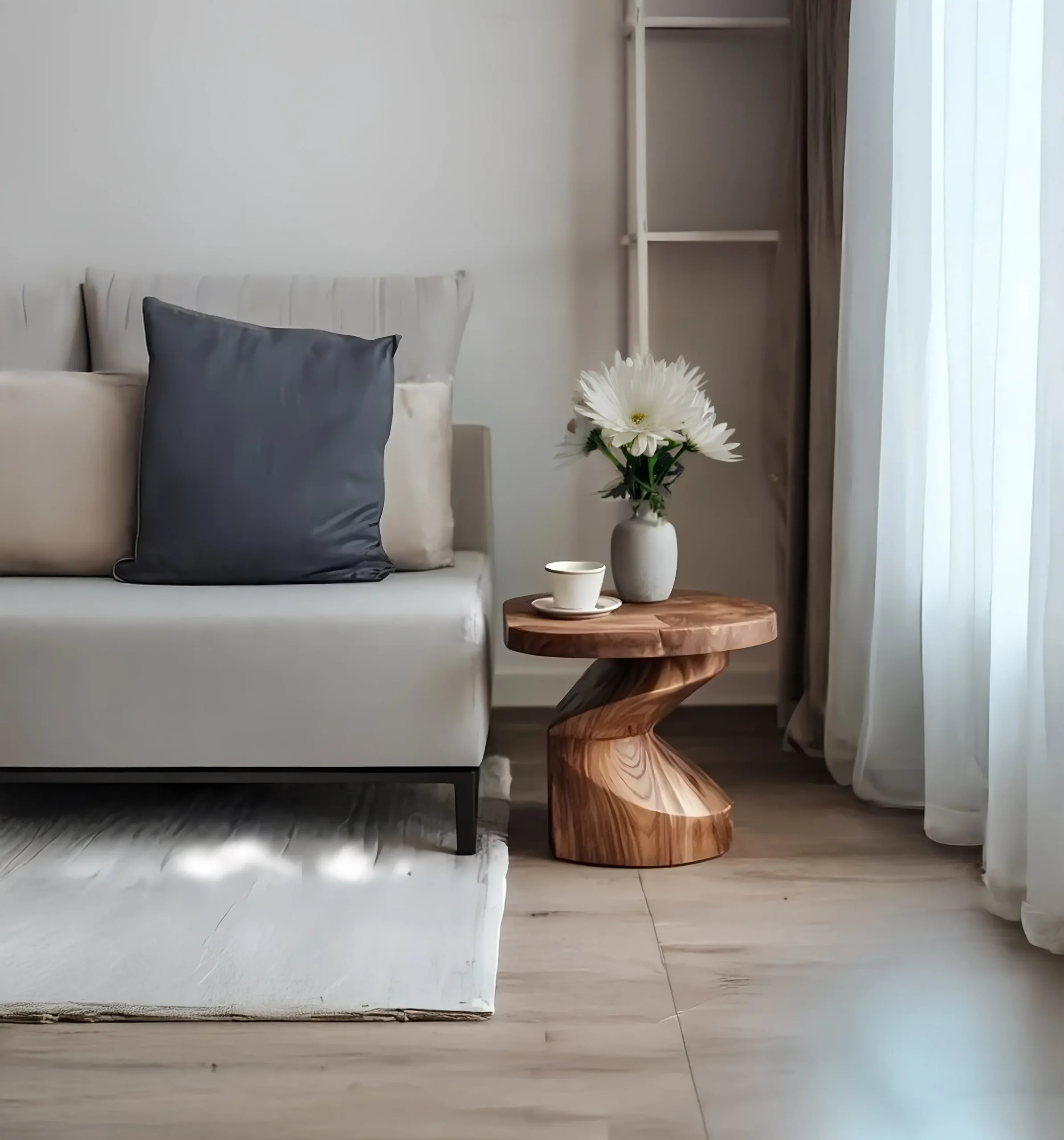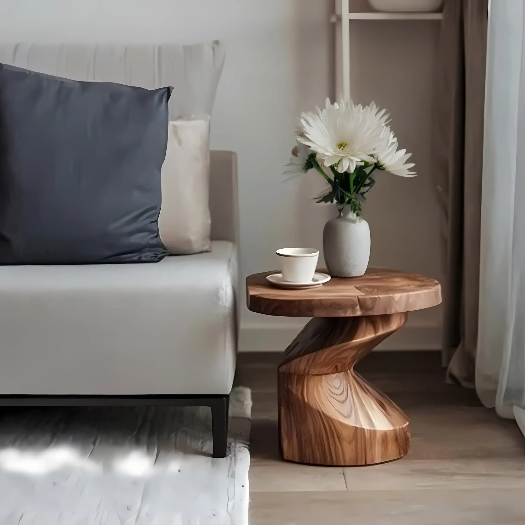 Add an artistic accent to your seating area with this spiral pedestal end table made from solid wood. The round top offers a simple surface for a mug, vase, or bedside essentials, while the twisted base creates a dynamic form that looks different from every angle. In the images, the base has a smooth hourglass shape with a diagonal spiral ridge that wraps around the center. The wood grain follows the curves, showing natural bands and knots that give the table depth and character. The top is slightly thick with softly rounded edges, designed to feel comfortable in everyday use. This piece works well as a bedroom nightstand, a living room end table, or a stand for a small plant where you want height without visual clutter. Because the base is a single continuous form, it pairs nicely with minimalist and Scandinavian inspired rooms, but the warm wood tone also complements farmhouse decor. For care, keep the surface dry, use coasters for hot drinks, and dust with a soft cloth. When relocating the table, lift it instead of dragging across flooring. Real wood will show natural variations in color and grain, and those differences are part of what makes a handcrafted table feel personal and authentic.